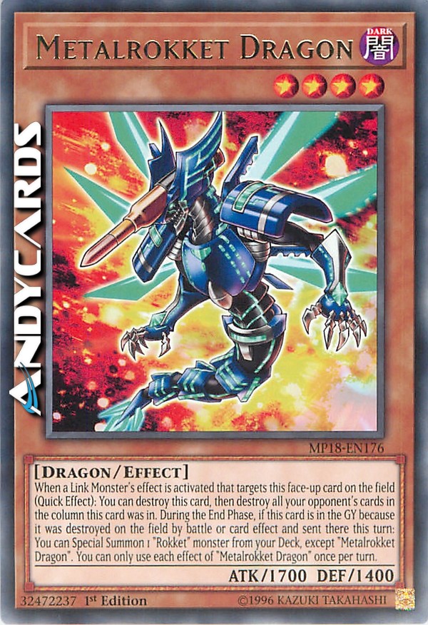 When a Link Monster's effect is activated that targets this face-up card on the field (Quick Effect): You can destroy this card, then destroy all your opponent's cards in the column this card was in. During the End Phase, if this card is in the GY because it was destroyed on the field by battle or card effect and sent there this turn: You can Special Summon 1 "Rokket" monster from your Deck, except "Metalrokket Dragon". You can only use each effect of "Metalrokket Dragon" once per turn.