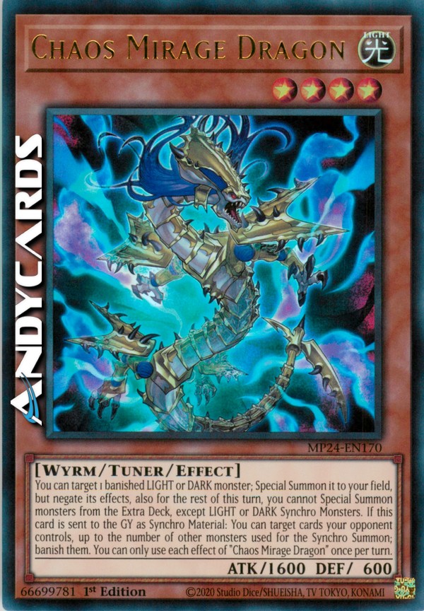 You can target 1 banished LIGHT or DARK monster; Special Summon it to your field, but negate its effects, also for the rest of this turn, you cannot Special Summon monsters from the Extra Deck, except LIGHT or DARK Synchro Monsters. If this card is sent to the GY as Synchro Material: You can target cards your opponent controls, up to the number of other monsters used for the Synchro Summon; banish them. You can only use each effect of "Chaos Mirage Dragon" once per turn.