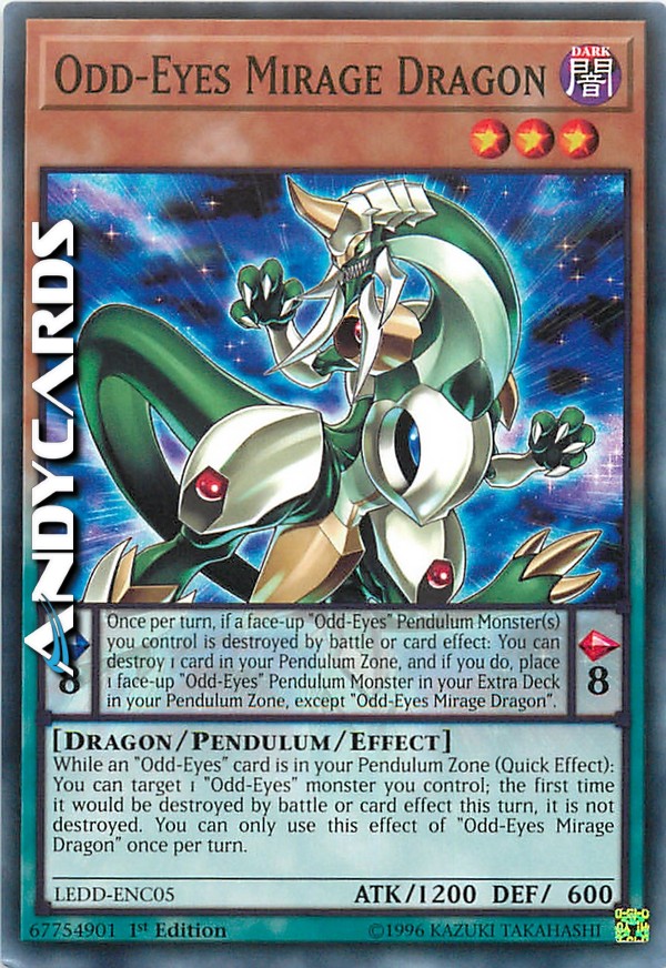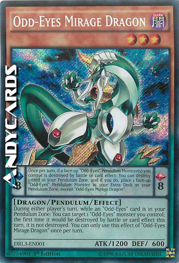 Pendulum Effect: Once per turn, if a face-up "Odd-Eyes" Pendulum Monster(s) you control is destroyed by battle or card effect: You can destroy 1 card in your Pendulum Zone, and if you do, place 1 face-up "Odd-Eyes" Pendulum Monster in your Extra Deck in your Pendulum Zone, except "Odd-Eyes Mirage Dragon".
