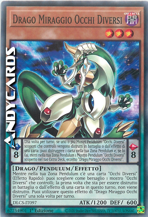 Una volta per turno, se uno o più Mostri Pendulum "Occhi Diversi" scoperti che controlli vengono distrutti in battaglia o dall'effetto di una carta: puoi distruggere 1 carta nella tua Zona Pendulum e, se lo fai, metti nella tua Zona Pendulum 1 Mostro Pendulum "Occhi Diversi" scoperto nel tuo Extra Deck, eccetto "Drago Miraggio Occhi Diversi". Durante il turno di qualsiasi giocatore, mentre nella tua Zona Pendulum c'è una carta "Occhi Diversi": puoi scegliere come bersaglio 1 mostro "Occhi Diversi" che controlli; la prima volta che sta per essere distrutto in battaglia o dall'effetto di una carta in questo turno, non viene distrutto. Puoi utilizzare questo effetto di "Drago Miraggio Occhi Diversi" una sola volta per turno.