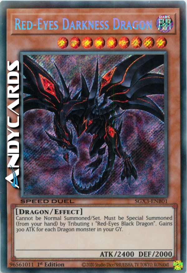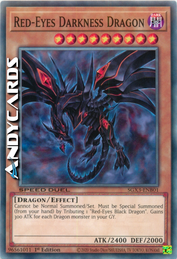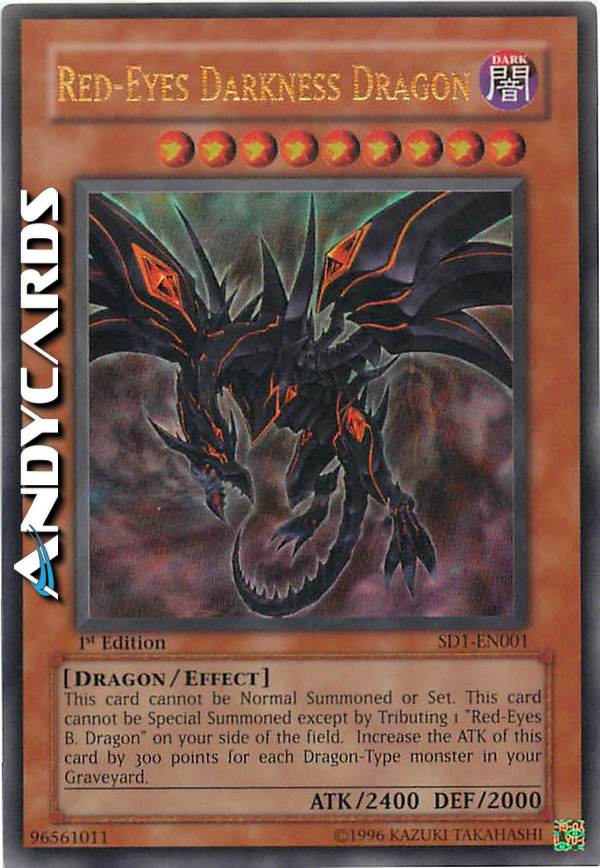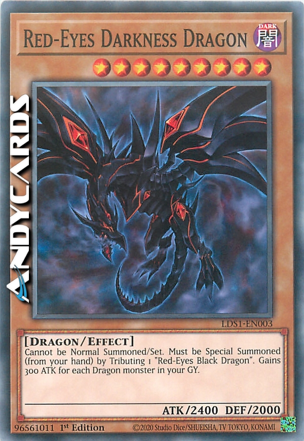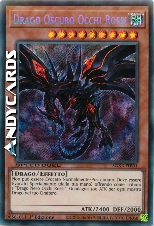 Questa carta non può essere Evocata tramite Evocazione Normale o Posizionata. Questa carta non può essere Evocata tramite Evocazione Speciale se non offrendo 1 "Drago Nero Occhi Rossi" sul tuo Terreno. Aumenta l'ATK di questa carta di 300 punti per ogni mostro di Tipo Drago nel tuo Cimitero.