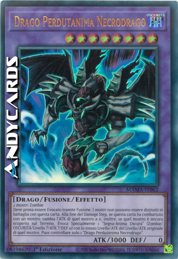 Deve prima essere Evocato tramite Fusione. I mostri non possono essere distrutti in battaglia con questa carta. Alla fine del Damage Step, se questa carta ha combattuto con un mostro che ha un Livello originale, l'ATK di quel mostro diventa 0, inoltre, se quel mostro è ancora scoperto sul Terreno, Evoca Specialmente 1 "Segna-Anima Oscura" (Tipo Zombie/OSCURITÀ/Livello ?/ATK ?/DEF 0). (Quando viene Evocato, il suo Livello e ATK diventano pari al Livello e ATK originali di quel mostro.) Puoi controllare solo 1 "Drago Perdutanima Necrodrago".