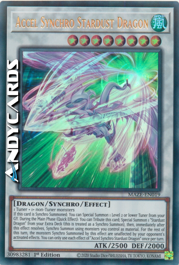 If this card is Synchro Summoned: You can Special Summon 1 Level 2 or lower Tuner from your GY. During the Main Phase (Quick Effect): You can Tribute this card; Special Summon 1 "Stardust Dragon" from your Extra Deck (this is treated as a Synchro Summon), then, immediately after this effect resolves, Synchro Summon using monsters you control as material. For the rest of this turn, the monsters Synchro Summoned by this effect are unaffected by your opponent's activated effects. You can only use each effect of "Accel Synchro Stardust Dragon" once per turn.