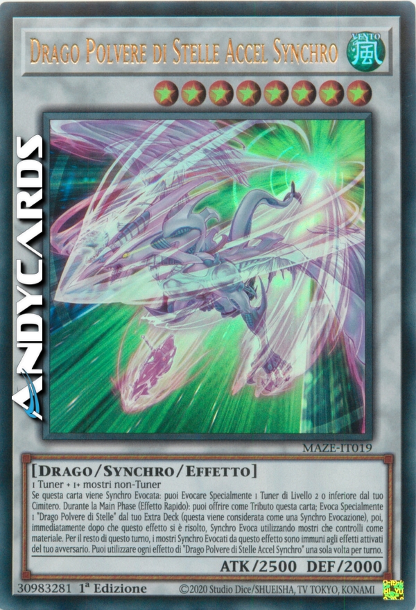 Se questa carta viene Synchro Evocata: puoi Evocare Specialmente 1 Tuner di Livello 2 o inferiore dal tuo Cimitero. Durante la Main Phase (Effetto Rapido): puoi offrire come Tributo questa carta; Evoca Specialmente 1 "Drago Polvere di Stelle" dal tuo Extra Deck (questa viene considerata come una Synchro Evocazione), poi, immediatamente dopo che questo effetto si è risolto, Synchro Evoca utilizzando mostri che controlli come materiale. Per il resto di questo turno, i mostri Synchro Evocati da questo effetto sono immuni agli effetti attivati del tuo avversario. Puoi utilizzare ogni effetto di "Drago Polvere di Stelle Accel Synchro" una sola volta per turno.