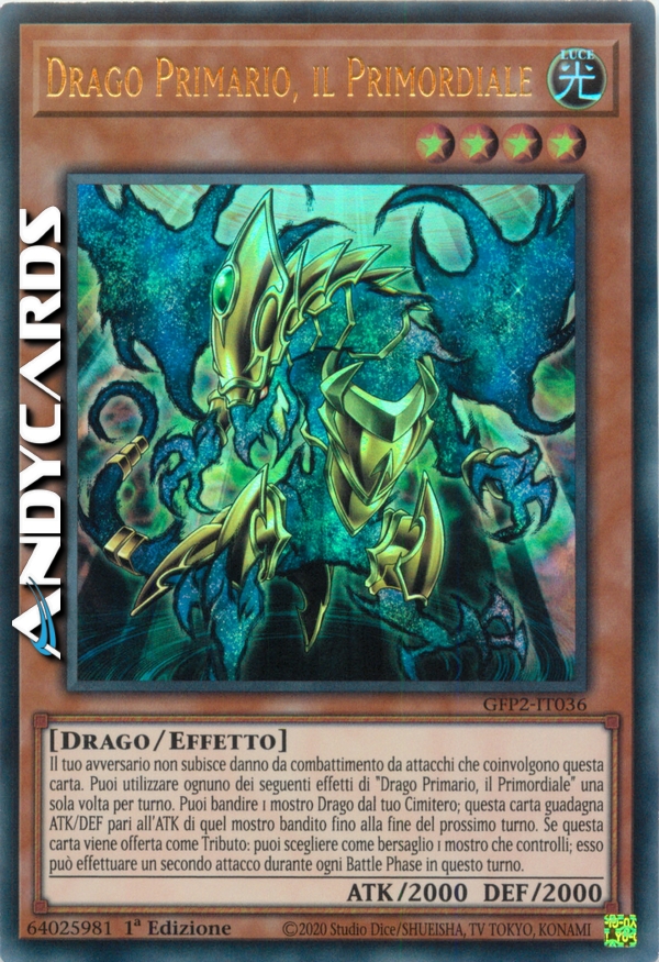 Il tuo avversario non subisce danno da combattimento da attacchi che coinvolgono questa carta. Puoi utilizzare ognuno dei seguenti effetti di "Drago Primario, il Primordiale" una sola volta per turno. Puoi bandire 1 mostro Drago dal tuo Cimitero; questa carta guadagna ATK/DEF pari all'ATK di quel mostro bandito fino alla fine del prossimo turno. Se questa carta viene offerta come Tributo: puoi scegliere come bersaglio 1 mostro che controlli; esso può effettuare un secondo attacco durante ogni Battle Phase in questo turno.