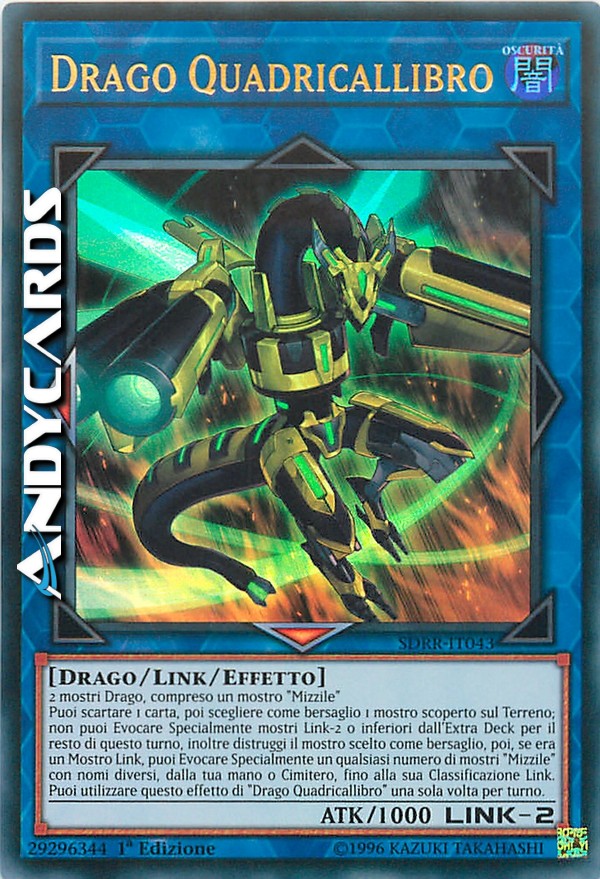 Puoi scartare 1 carta, poi scegliere come bersaglio 1 mostro scoperto sul Terreno; non puoi Evocare Specialmente mostri Link-2 o inferiori dall'Extra Deck per il resto di questo turno, inoltre distruggi il mostro scelto come bersaglio, poi, se era un Mostro Link, puoi Evocare Specialmente un qualsiasi numero di mostri "Mizzile" con nomi diversi, dalla tua mano o Cimitero, fino alla sua Classificazione Link. Puoi utilizzare questo effetto di "Drago Quadricallibro" una sola volta per turno.