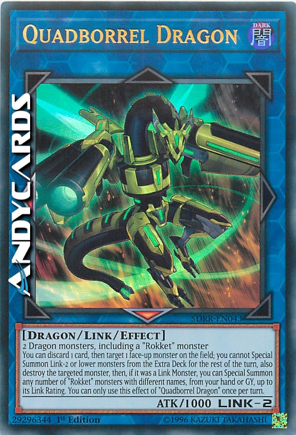 You can discard 1 card, then target 1 face-up monster on the field; you cannot Special Summon Link-2 or lower monsters from the Extra Deck for the rest of the turn, also destroy the targeted monster, then, if it was a Link Monster, you can Special Summon any number of "Rokket" monsters with different names, from your hand or GY, up to its Link Rating. You can only use this effect of "Quadborrel Dragon" once per turn.