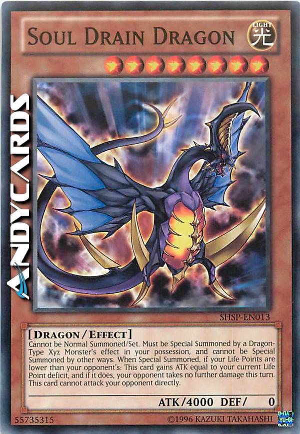 Non può essere Evocato Normalmente/Posizionato. Deve essere Evocato Specialmente dall'effetto di un Mostro Xyz di Tipo Drago sotto il tuo comando, e non può essere Evocato Specialmente in altri modi. Quando viene Evocato Specialmente, se i tuoi Life Point sono più bassi di quelli del tuo avversario; questa carta guadagna ATK pari alla differenza di Life Point attuale e, se lo fa, il tuo avversario non subisce ulteriori danni in questo turno. Questa carta non può attaccare il tuo avversario direttamente.