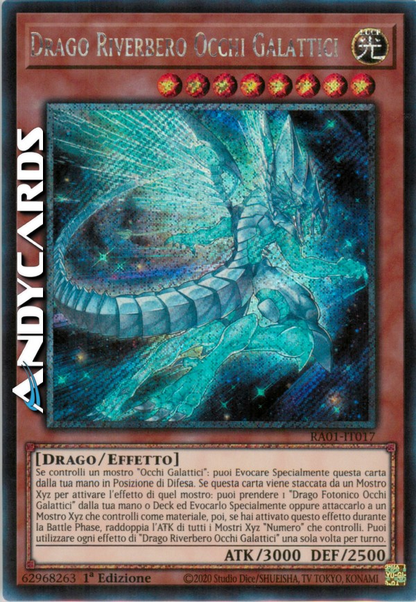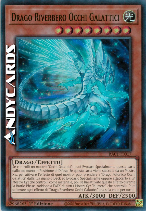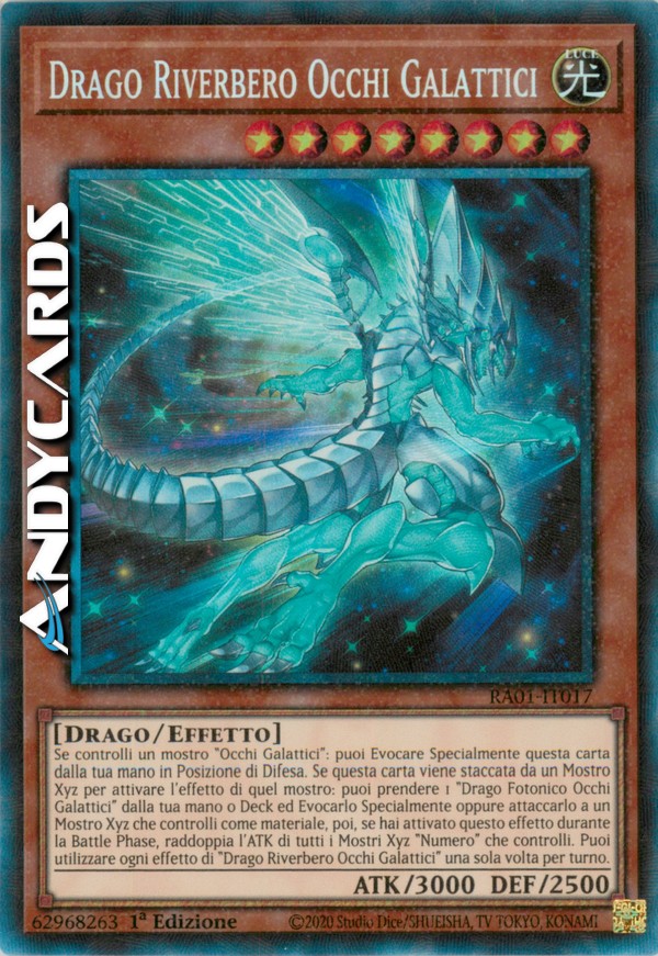 Se controlli un mostro "Occhi Galattici": puoi Evocare Specialmente questa carta dalla tua mano in Posizione di Difesa. Se questa carta viene staccata da un Mostro Xyz per attivare l'effetto di quel mostro: puoi prendere 1 "Drago Fotonico Occhi Galattici" dalla tua mano o Deck ed Evocarlo Specialmente oppure attaccarlo a un Mostro Xyz che controlli come materiale, poi, se hai attivato questo effetto durante la Battle Phase, raddoppia l'ATK di tutti i Mostri Xyz "Numero" che controlli. Puoi utilizzare ogni effetto di "Drago Riverbero Occhi Galattici" una sola volta per turno.