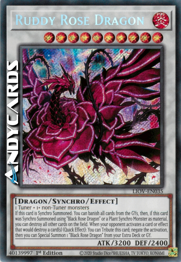 1 Tuner + 1+ non-Tuner monsters If this card is Synchro Summoned: You can banish all cards from the GYs, then, if this card was Synchro Summoned using "Black Rose Dragon" or a Plant Synchro Monster as material, you can destroy all other cards on the field. When your opponent activates a card or effect that would destroy a card(s) (Quick Effect): You can Tribute this card; negate the activation, then you can Special Summon 1 "Black Rose Dragon" from your Extra Deck or GY.