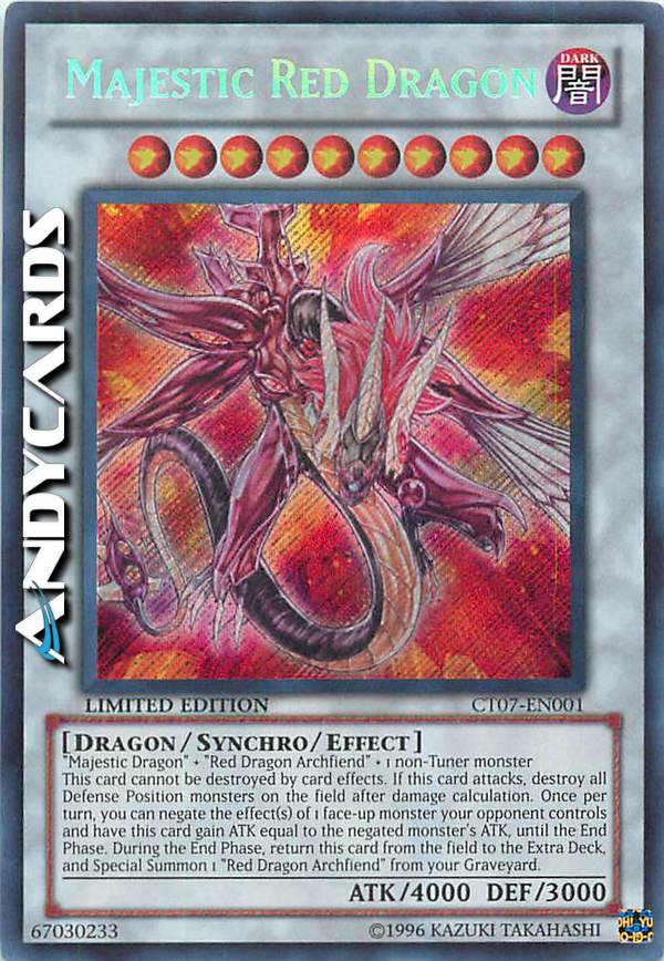 "Majestic Dragon" + "Red Dragon Archfiend" + 1 non-Tuner monster. This card cannot be destroyed by card effects. If this card attacks, destroy all Defense Position monsters on the field after damage calculation. Once per turn, you can negate the effect(s) of 1 face-up monster your opponent controls and have this card gain ATK equal to the negated monster's ATK, until the End Phase. During the End Phase, return this card from the field to the Extra Deck, and Special Summon 1 "Red Dragon Archfiend" from your Graveyard.