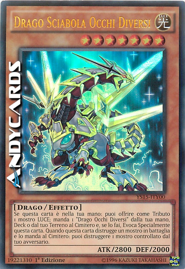 Se questa carta è nella tua mano: puoi offrire come Tributo 1 mostro LUCE; manda 1 "Drago Occhi Diversi" dalla tua mano, Deck o dal tuo Terreno al Cimitero e, se lo fai, Evoca Specialmente questa carta. Quando questa carta distrugge un mostro in battaglia e lo manda al Cimitero: puoi distruggere 1 mostro controllato dal tuo avversario.