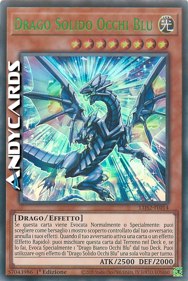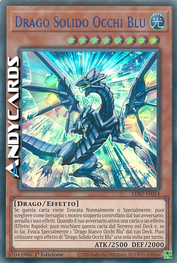 Se questa carta viene Evocata Normalmente o Specialmente: puoi scegliere come bersaglio 1 mostro scoperto controllato dal tuo avversario; annulla i suoi effetti. Quando il tuo avversario attiva una carta o un effetto (Effetto Rapido): puoi mischiare questa carta dal Terreno nel Deck e, se lo fai, Evoca Specialmente 1 "Drago Bianco Occhi Blu" dal tuo Deck. Puoi utilizzare ogni effetto di "Drago Solido Occhi Blu" una sola volta per turno.