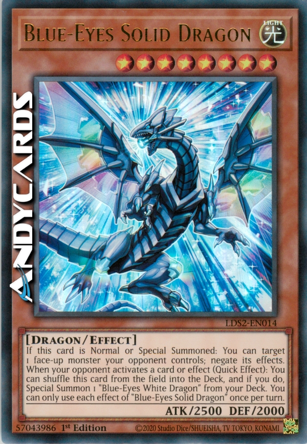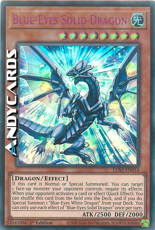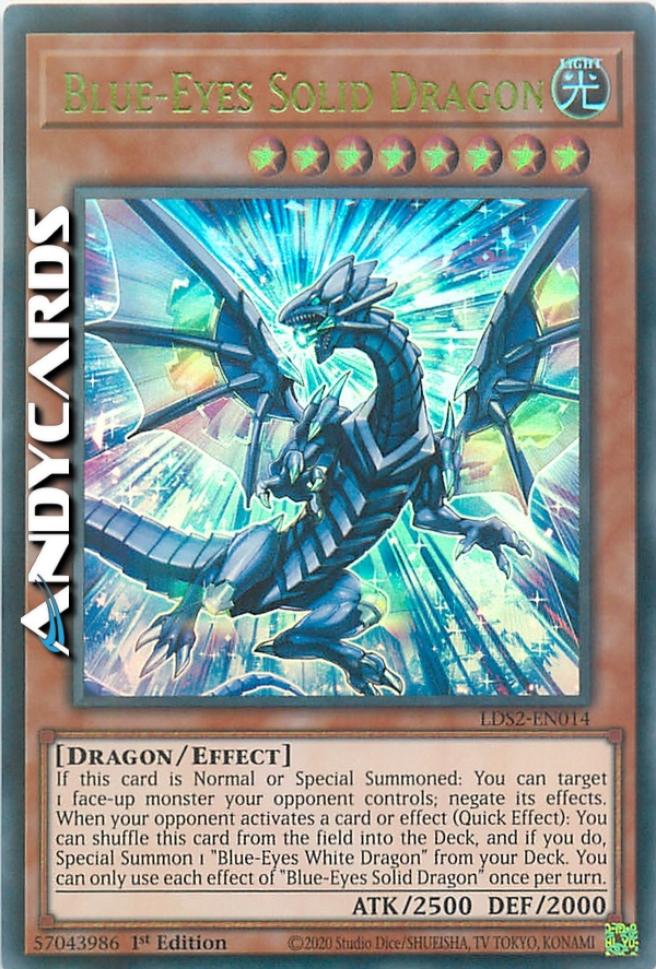 If this card is Normal or Special Summoned: You can target 1 face-up monster your opponent controls; negate its effects. When your opponent activates a card or effect (Quick Effect): You can shuffle this card from the field into the Deck, and if you do, Special Summon 1 "Blue-Eyes White Dragon" from your Deck. You can only use each effect of "Blue-Eyes Solid Dragon" once per turn.