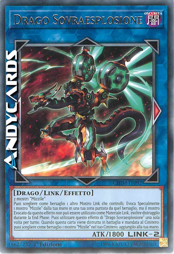 Puoi scegliere come bersaglio 1 altro Mostro Link che controlli; Evoca Specialmente 1 mostro "Mizzile" dalla tua mano in una tua zona puntata da quel bersaglio, ma il mostro Evocato da questo effetto non può essere utilizzato come Materiale Link, inoltre distruggilo durante la End Phase. Puoi utilizzare questo effetto di "Drago Sovraesplosione" una sola volta per turno. Quando questa carta viene distrutta in battaglia e mandata al Cimitero: puoi scegliere come bersaglio 1 mostro "Mizzile" nel tuo Cimitero; aggiungilo alla tua mano.