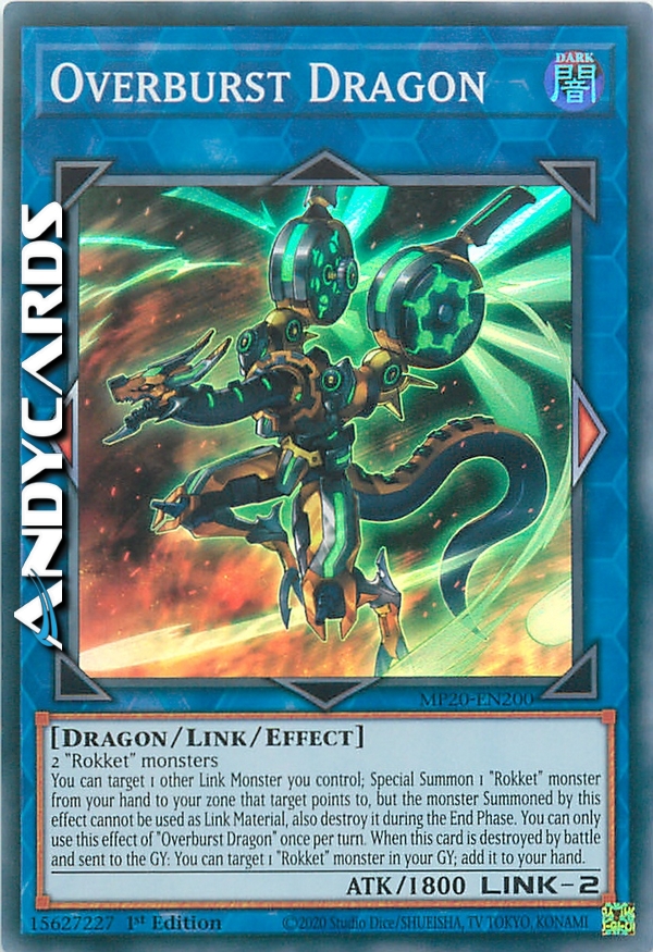 You can target 1 other Link Monster you control; Special Summon 1 "Rokket" monster from your hand to your zone that target points to, but the monster Summoned by this effect cannot be used as Link Material, also destroy it during the End Phase. You can only use this effect of "Overburst Dragon" once per turn. When this card is destroyed by battle and sent to the GY: You can target 1 "Rokket" monster in your GY; add it to your hand.