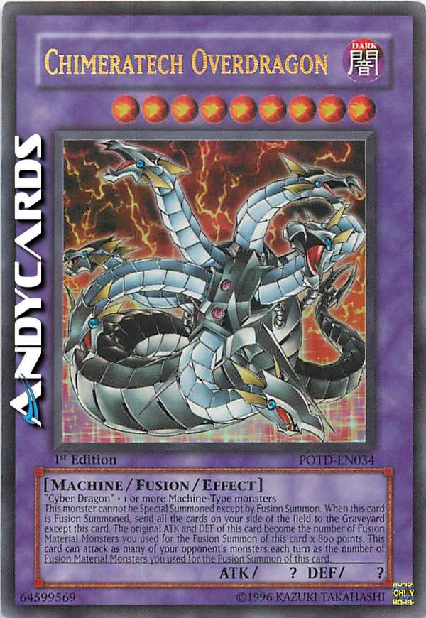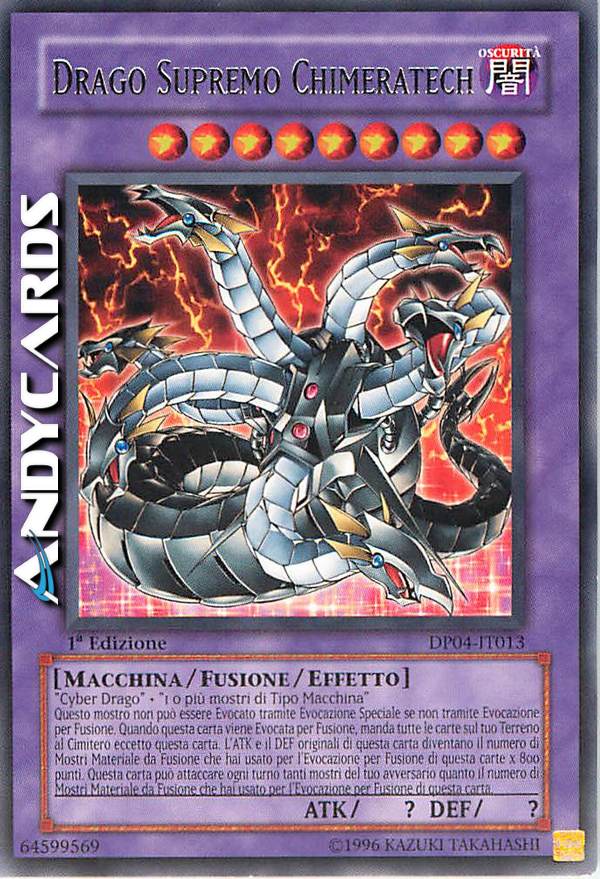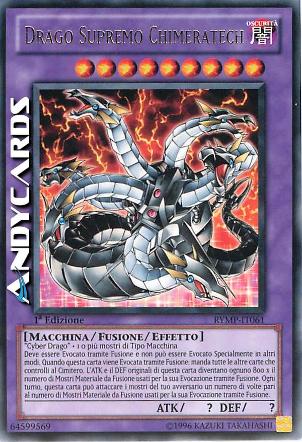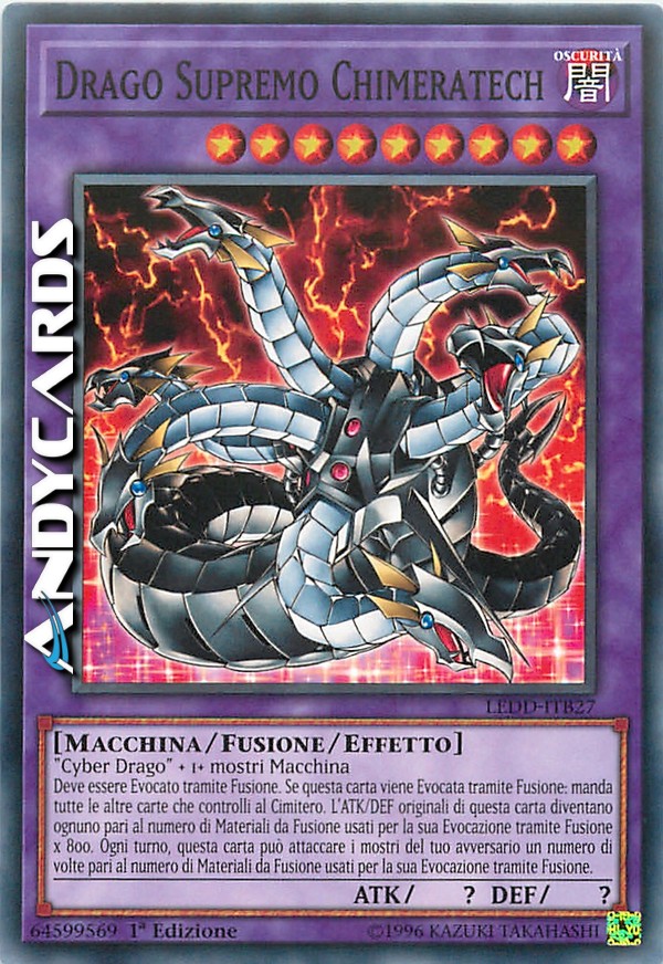 Cyber Drago + 1 o più mostri di Tipo Macchina.Questo mostro non può essere Evocato tramite Evocazione Speciale se non tramite Evocazione per Fusione. Quando questa carta viene Evocata per Fusione, manda tutte le carte sul tuo terreno al Cimitero eccetto questa carta. L'ATK e il DEF originali di questa carta diventano il numero di Mostri Materiale da Fusione che hai usato per l'Evocazione per Fusione di questa carta x 800 punti. Questa carta può attaccare ogni turno tanti mostri del tuo avversario quanto il numero di Mostri Materiale da Fusione che hai usato per l'Evocazione per Fusione di questa carta.