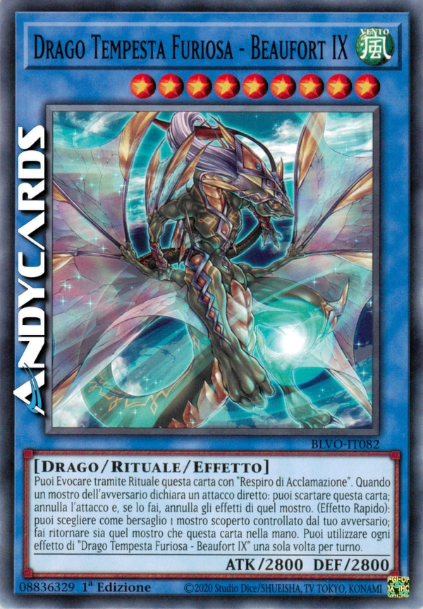 Puoi Evocare tramite Rituale questa carta con "Respiro di Acclamazione". Quando un mostro dell'avversario dichiara un attacco diretto: puoi scartare questa carta; annulla l'attacco e, se lo fai, annulla gli effetti di quel mostro. (Effetto Rapido): puoi scegliere come bersaglio 1 mostro scoperto controllato dal tuo avversario; fai ritornare sia quel mostro che questa carta nella mano. Puoi utilizzare ogni effetto di "Drago Tempesta Furiosa - Beaufort IX" una sola volta per turno.