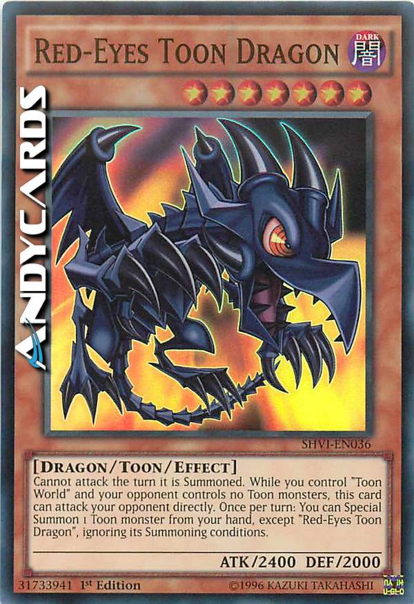 Non può attaccare nel turno in cui è stato Evocato. Mentre controlli "Mondo Toon" e il tuo avversario non controlla nessun mostro Toon, questa carta può attaccare il tuo avversario direttamente. Una volta per turno: puoi Evocare Specialmente 1 mostro Toon dalla tua mano, eccetto "Drago Toon Occhi Rossi", ignorando le sue condizioni di Evocazione.