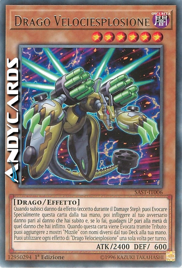 Quando subisci danno da effetto (eccetto durante il Damage Step): puoi Evocare Specialmente questa carta dalla tua mano, poi infliggere al tuo avversario danno pari al danno che hai subito e, se lo fai, guadagni LP pari alla metà di quel danno che hai inflitto. Quando questa carta viene Evocata tramite Tributo: puoi aggiungere 2 mostri "Mizzile" con nomi diversi dal tuo Deck alla tua mano. Puoi utilizzare ogni effetto di "Drago Velociesplosione" una sola volta per turno.
