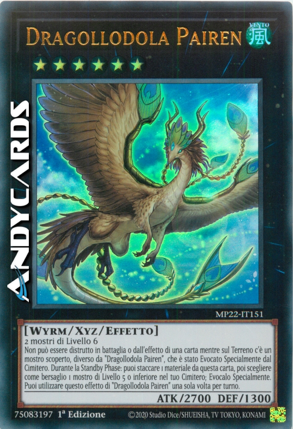 Non può essere distrutto in battaglia o dall'effetto di una carta mentre sul Terreno c'è un mostro scoperto, diverso da "Dragollodola Pairen", che è stato Evocato Specialmente dal Cimitero. Durante la Standby Phase: puoi staccare 1 materiale da questa carta, poi scegliere come bersaglio 1 mostro di Livello 5 o inferiore nel tuo Cimitero; Evocalo Specialmente. Puoi utilizzare questo effetto di "Dragollodola Pairen" una sola volta per turno.