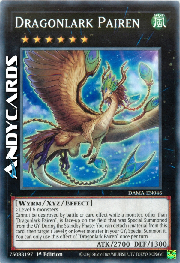 Cannot be destroyed by battle or card effect while a monster, other than "Dragonlark Pairen", is face-up on the field that was Special Summoned from the GY. During the Standby Phase: You can detach 1 material from this card, then target 1 Level 5 or lower monster in your GY; Special Summon it. You can only use this effect of "Dragonlark Pairen" once per turn.