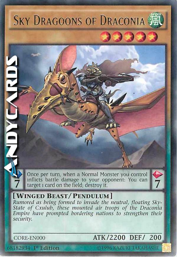 Rumored as being formed to invade the neutral, floating Sky-State of Cxulub, these mounted air troops of the Draconia Empire have prompted bordering nations to strengthen their security. Pendulum Effect: Once per turn, when a Normal Monster you control inflicts battle damage to your opponent: You can target 1 card on the field; destroy it.