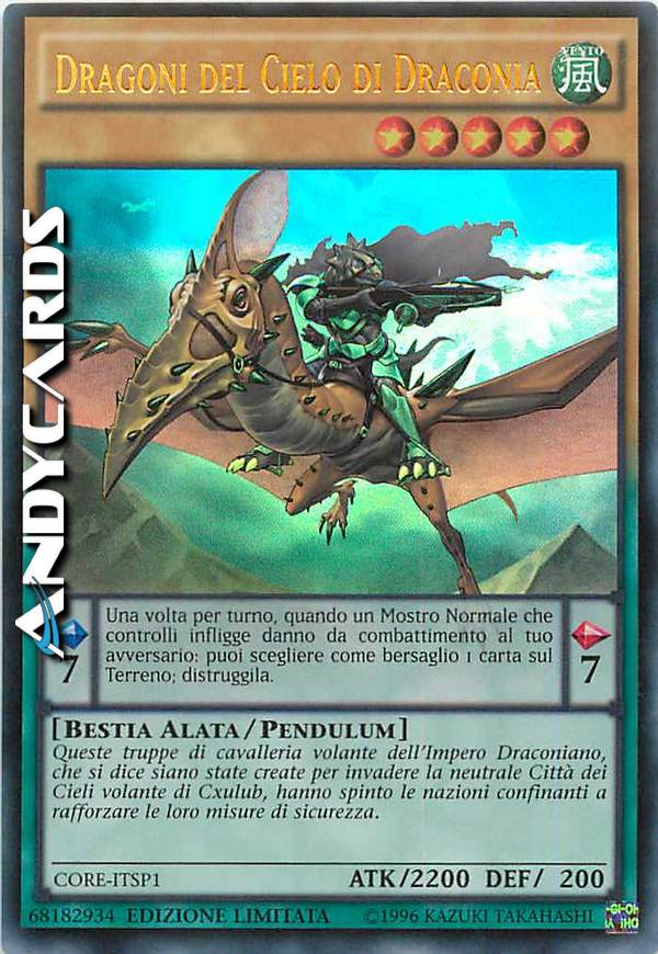 Queste truppe di cavalleria volante dell'Impero Draconiano, che si dice siano state create per invadere la neutrale Città dei Cieli volante di Cxulub, hanno spinto le nazioni confinanti a rafforzare le loro misure di sicurezza. Effetto Pendulum: Una volta per turno, quando un Mostro Normale che controlli infligge danno da combattimento al tuo avversario: puoi scegliere come bersaglio 1 carta sul Terreno; distruggila.