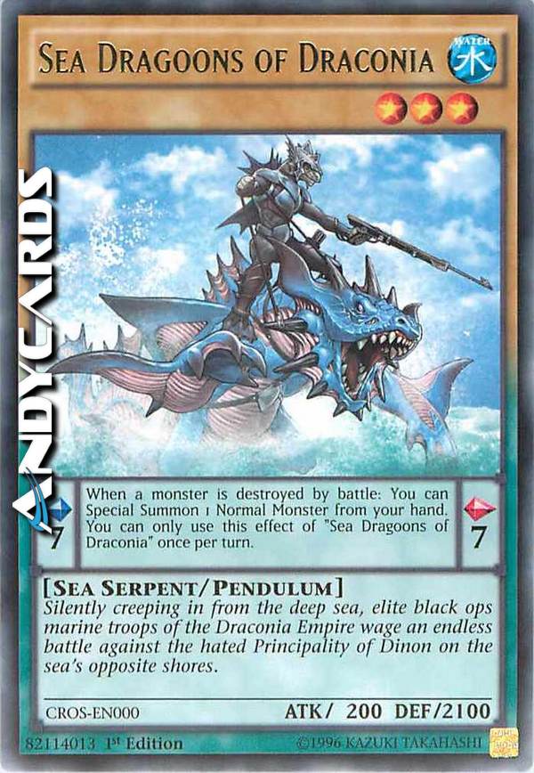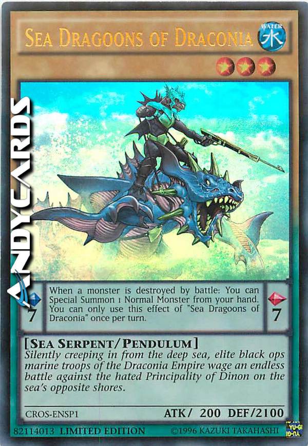 Silently creeping in from the deep sea, elite black ops marine troops of the Draconia Empire wage an endless battle against the hated Principality of Dinon on the sea's opposite shores. Pendulum Effect: When a monster is destroyed by battle: You can Special Summon 1 Normal Monster from your hand. You can only use this effect of "Sea Dragoons of Draconia" once per turn.