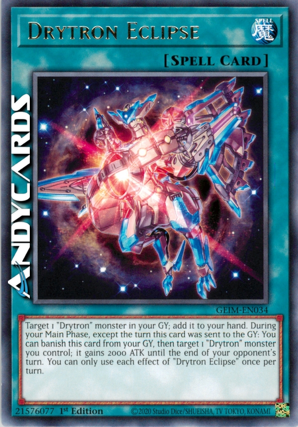 Target 1 "Drytron" monster in your GY; add it to your hand. During your Main Phase, except the turn this card was sent to the GY: You can banish this card from your GY, then target 1 "Drytron" monster you control; it gains 2000 ATK until the end of your opponent's turn. You can only use each effect of "Drytron Eclipse" once per turn.