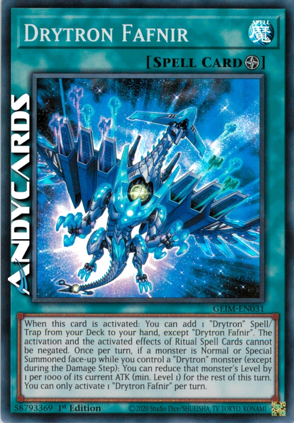 When this card is activated: You can add 1 "Drytron" Spell/Trap from your Deck to your hand, except "Drytron Fafnir". The activation and the activated effects of Ritual Spell Cards cannot be negated. Once per turn, if a monster is Normal or Special Summoned face-up while you control a "Drytron" monster (except during the Damage Step): You can reduce that monster's Level by 1 per 1000 of its current ATK (min. Level 1) for the rest of this turn. You can only activate 1 "Drytron Fafnir" per turn.