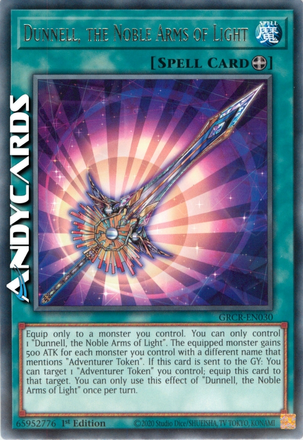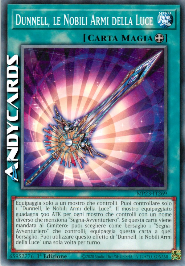 Equipaggia solo a un mostro che controlli. Puoi controllare solo 1 "Dunnell, le Nobili Armi della Luce". Il mostro equipaggiato guadagna 500 ATK per ogni mostro che controlli con un nome diverso che menziona "Segna-Avventuriero". Se questa carta viene mandata al Cimitero: puoi scegliere come bersaglio 1 "Segna-Avventuriero" che controlli; equipaggia questa carta a quel bersaglio. Puoi utilizzare questo effetto di "Dunnell, le Nobili Armi della Luce" una sola volta per turno.