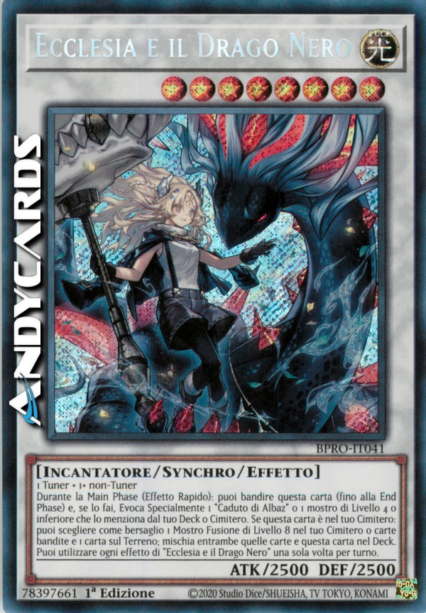 Durante la Main Phase (Effetto Rapido): puoi bandire questa carta (fino alla End Phase) e, se lo fai, Evoca Specialmente 1 "Caduto di Albaz" o 1 mostro di Livello 4 o inferiore che lo menziona dal tuo Deck o Cimitero. Se questa carta è nel tuo Cimitero: puoi scegliere come bersaglio 1 Mostro Fusione di Livello 8 nel tuo Cimitero o carte bandite e 1 carta sul Terreno; mischia entrambe quelle carte e questa carta nel Deck. Puoi utilizzare ogni effetto di "Ecclesia e il Drago Nero" una sola volta per turno.
