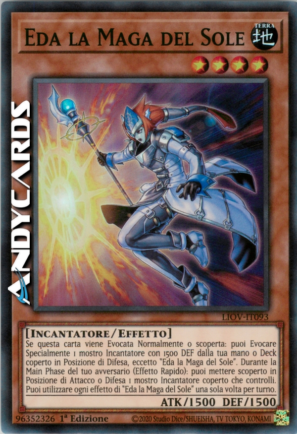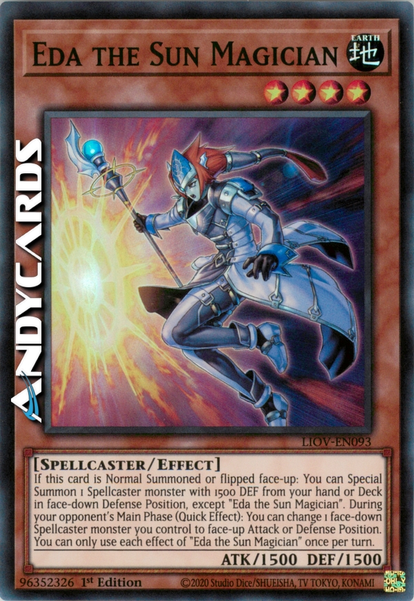 Se questa carta viene Evocata Normalmente o scoperta: puoi Evocare Specialmente 1 mostro Incantatore con 1500 DEF dalla tua mano o Deck coperto in Posizione di Difesa, eccetto "Eda la Maga del Sole". Durante la Main Phase del tuo avversario (Effetto Rapido): puoi mettere scoperto in Posizione di Attacco o Difesa 1 mostro Incantatore coperto che controlli. Puoi utilizzare ogni effetto di "Eda la Maga del Sole" una sola volta per turno.