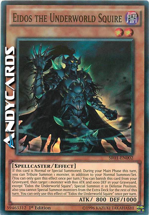 Se questa carta viene Evocata Normalmente o Specialmente: durante la tua Main Phase in questo turno puoi Evocare tramite Tributo 1 mostro, in aggiunta alla tua Evocazione/Posizionamento normale. (Puoi guadagnare questo effetto una sola volta per turno.) Puoi bandire questa carta dal tuo Cimitero, poi scegliere come bersaglio 1 mostro con ATK 800 e DEF 1000 nel tuo Cimitero, eccetto "Eidos Scudiero del Mondo Sotterraneo"; Evocalo Specialmente in Posizione di Difesa, inoltre non puoi Evocare Specialmente mostri dall'Extra Deck per il resto di questo turno. Puoi utilizzare questo effetto di "Eidos Scudiero del Mondo Sotterraneo" una sola volta per turno.