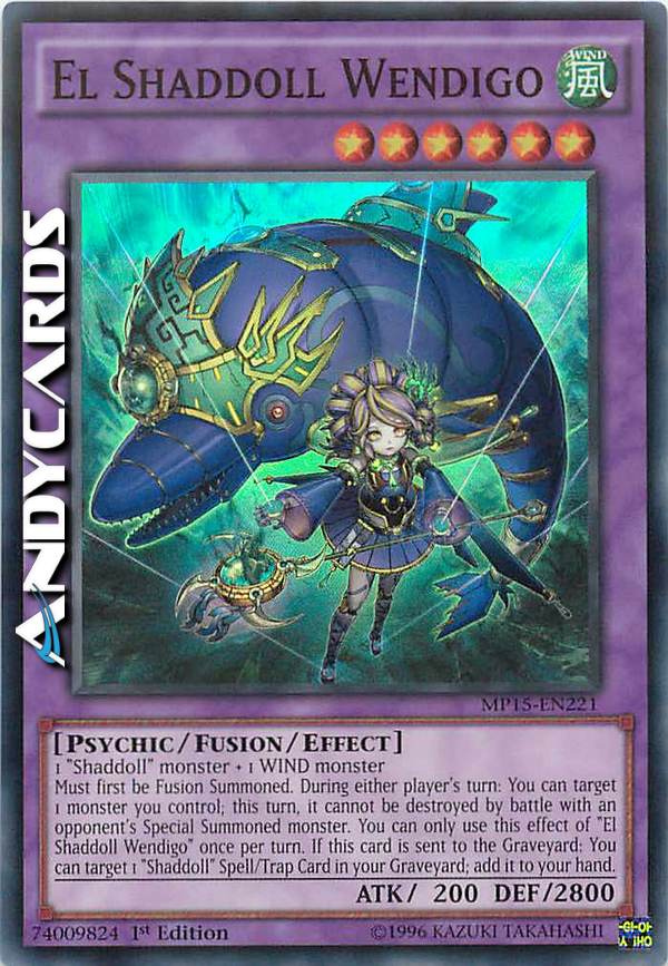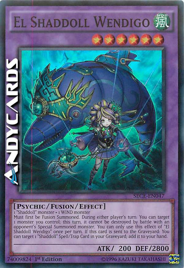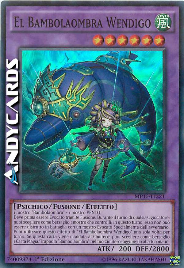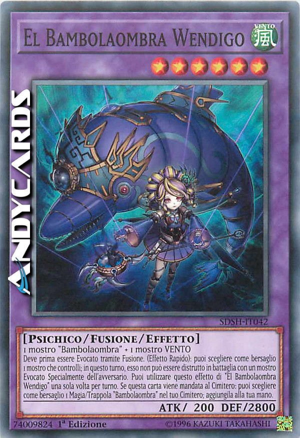 Deve prima essere Evocato tramite Fusione. Durante il turno di qualsiasi giocatore: puoi scegliere come bersaglio 1 mostro che controlli; in questo turno esso non può essere distrutto in battaglia con un mostro Evocato Specialmente dell'avversario. Puoi utilizzare questo effetto di "El Bambolaombra Wendigo" una sola votla per turno. Se questa carta viene mandata al Cimitero: puoi scegliere come bersaglio 1 Carta Magia/Trappola "Bambolaombra" nel tuo Cimitero; aggiungila alla tua mano.