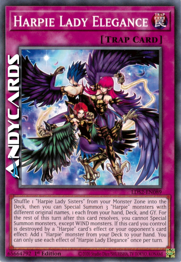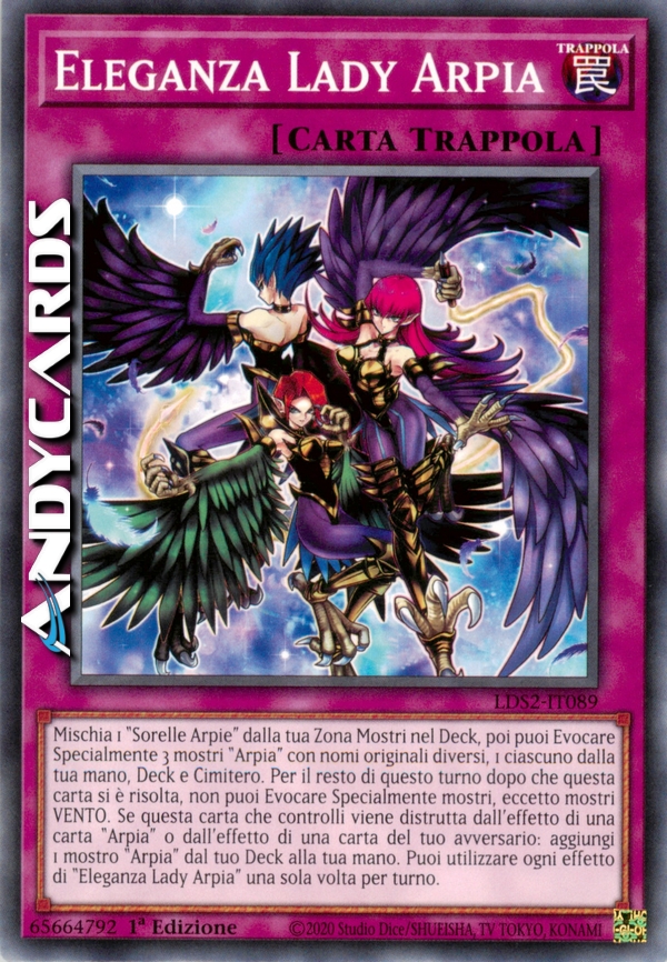 Mischia 1 "Sorelle Arpie" dalla tua Zona Mostri nel Deck, poi puoi Evocare Specialmente 3 mostri "Arpia" con nomi originali diversi, 1 ciascuno dalla tua mano, Deck e Cimitero. Per il resto di questo turno dopo che questa carta si è risolta, non puoi Evocare Specialmente mostri, eccetto mostri VENTO. Se questa carta che controlli viene distrutta dall'effetto di una carta "Arpia" o dall'effetto di una carta del tuo avversario: aggiungi 1 mostro "Arpia" dal tuo Deck alla tua mano. Puoi utilizzare ogni effetto di "Eleganza Lady Arpia" una sola volta per turno.