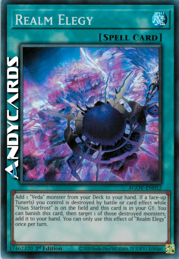 Add 1 "Veda" monster from your Deck to your hand. If a face-up Tuner(s) you control is destroyed by battle or card effect while "Visas Starfrost" is on the field and this card is in your GY: You can banish this card, then target 1 of those destroyed monsters; add it to your hand. You can only use this effect of "Realm Elegy" once per turn.