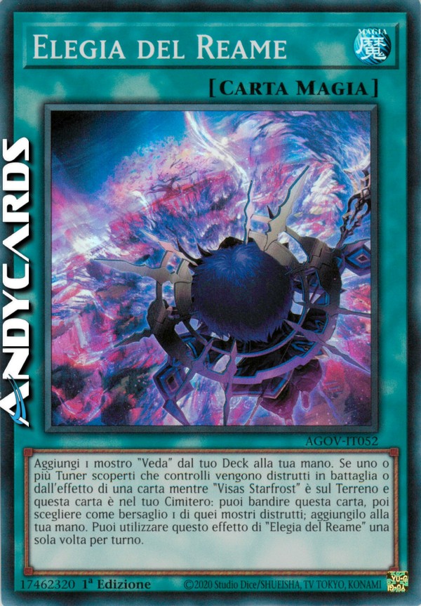 Aggiungi 1 mostro "Veda" dal tuo Deck alla tua mano. Se uno o più Tuner scoperti che controlli vengono distrutti in battaglia o dall'effetto di una carta mentre "Visas Starfrost" è sul Terreno e questa carta è nel tuo Cimitero: puoi bandire questa carta, poi scegliere come bersaglio 1 di quei mostri distrutti; aggiungilo alla tua mano. Puoi utilizzare questo effetto di "Elegia del Reame" una sola volta per turno.