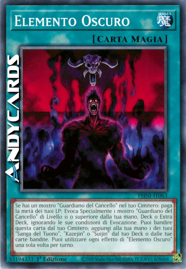 Se hai un mostro "Guardiano del Cancello" nel tuo Cimitero: paga la metà dei tuoi LP; Evoca Specialmente 1 mostro "Guardiano del Cancello" di Livello 11 o superiore dalla tua mano, Deck o Extra Deck, ignorando le sue condizioni di Evocazione. Puoi bandire questa carta dal tuo Cimitero; aggiungi alla tua mano 1 dei tuoi "Sanga del Tuono", "Kazejin" o "Suijin" dal tuo Deck o dalle tue carte bandite. Puoi utilizzare ogni effetto di "Elemento Oscuro" una sola volta per turno.