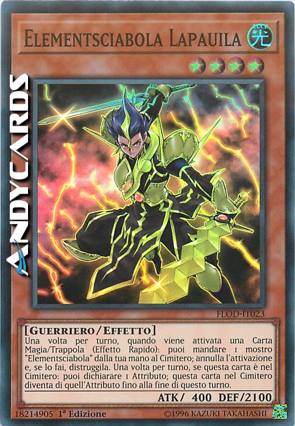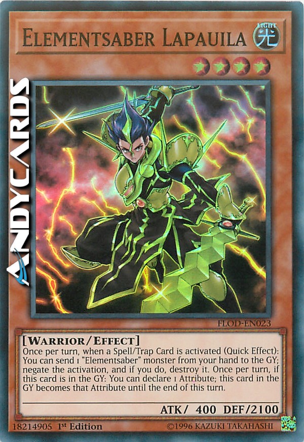 Una volta per turno, quando viene attivata una Carta Magia/Trappola (Effetto Rapido): puoi mandare 1 mostro "Elementsciabola" dalla tua mano al Cimitero; annulla l'attivazione e, se lo fai, distruggila. Una volta per turno, se questa carta è nel Cimitero: puoi dichiarare 1 Attributo; questa carta nel Cimitero diventa di quell'Attributo fino alla fine di questo turno.