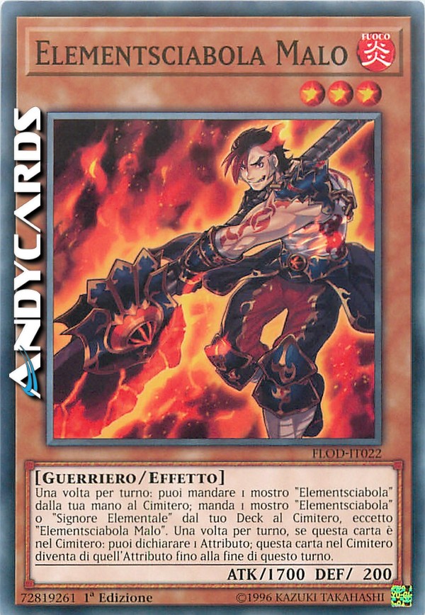 Una volta per turno: puoi mandare 1 mostro "Elementsciabola" dalla tua mano al Cimitero; manda 1 mostro "Elementsciabola" o "Signore Elementale" dal tuo Deck al Cimitero, eccetto "Elementsciabola Malo". Una volta per turno, se questa carta è nel Cimitero: puoi dichiarare 1 Attributo; questa carta nel Cimitero diventa di quell'Attributo fino alla fine di questo turno.