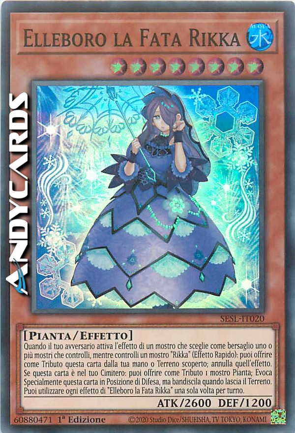 Quando il tuo avversario attiva l'effetto di un mostro che sceglie come bersaglio uno o più mostri che controlli, mentre controlli un mostro "Rikka" (Effetto Rapido): puoi offrire come Tributo questa carta dalla tua mano o Terreno scoperto; annulla quell'effetto. Se questa carta è nel tuo Cimitero: puoi offrire come Tributo 1 mostro Pianta; Evoca Specialmente questa carta in Posizione di Difesa, ma bandiscila quando lascia il Terreno. Puoi utilizzare ogni effetto di "Elleboro la Fata Rikka" una sola volta per turno.