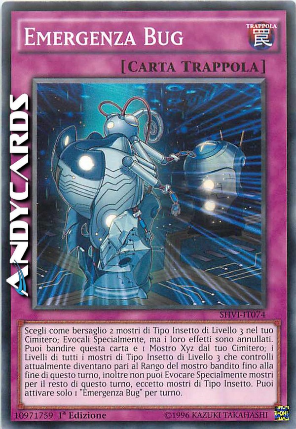 Scegli come bersaglio 2 mostri di Tipo Insetto di Livello 3 nel tuo Cimitero; Evocali Specialmente, ma i loro effetti sono annullati. Puoi bandire questa carta e 1 Mostro Xyz dal tuo Cimitero; i Livelli di tutti i mostri di Tipo Insetto di Livello 3 che controlli attualmente diventano pari al Rango del mostro bandito fino alla fine di questo turno, inoltre non puoi Evocare Specialmente mostri per il resto di questo turno, eccetto mostri di Tipo Insetto. Puoi attivare solo 1 "Emergenza Bug" per turno.