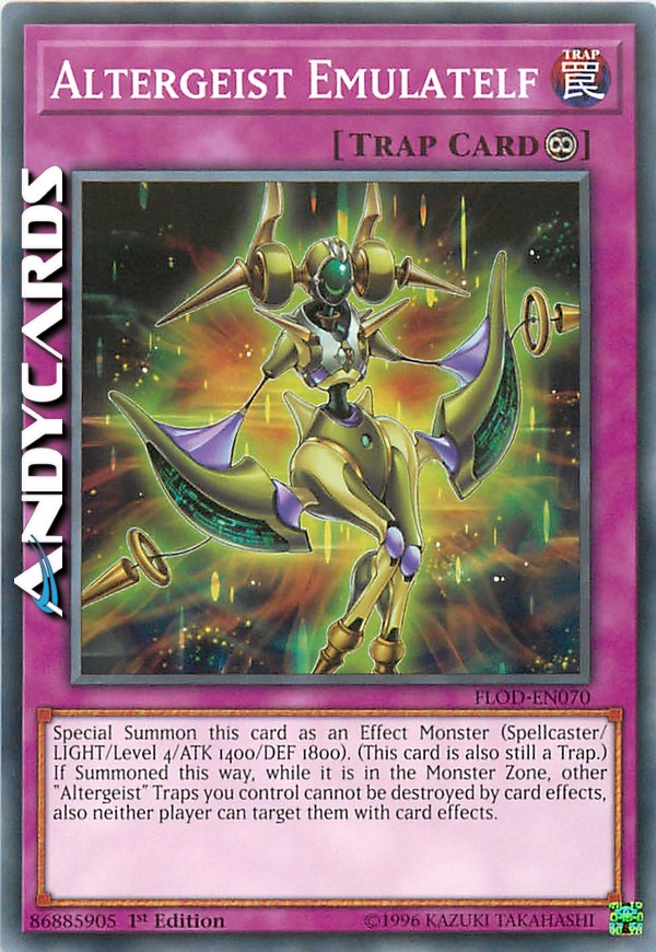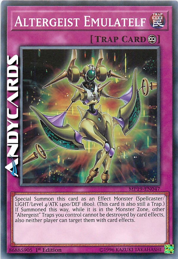 Special Summon this card as an Effect Monster (Spellcaster/LIGHT/Level 4/ATK 1400/DEF 1800). (This card is also still a Trap.) If Summoned this way, while it is in the Monster Zone, other "Altergeist" Traps you control cannot be destroyed by card effects, also neither player can target them with card effects.