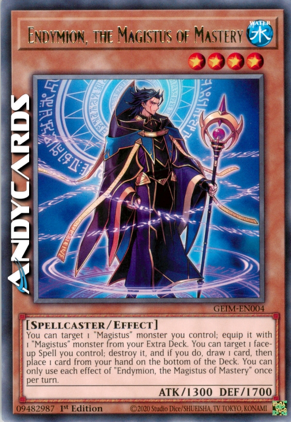You can target 1 "Magistus" monster you control; equip it with 1 "Magistus" monster from your Extra Deck. You can target 1 face-up Spell you control; destroy it, and if you do, draw 1 card, then place 1 card from your hand on the bottom of the Deck. You can only use each effect of "Endymion, the Magistus of Mastery" once per turn.
