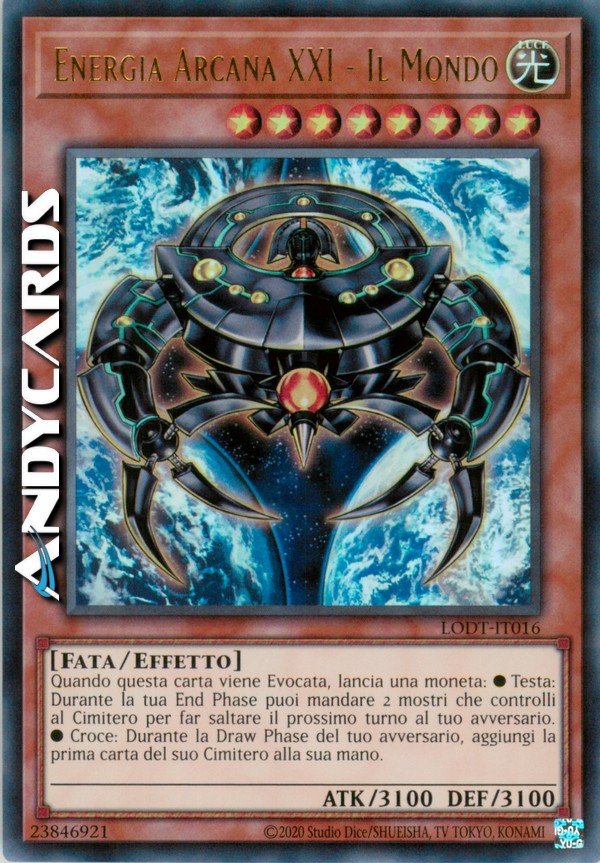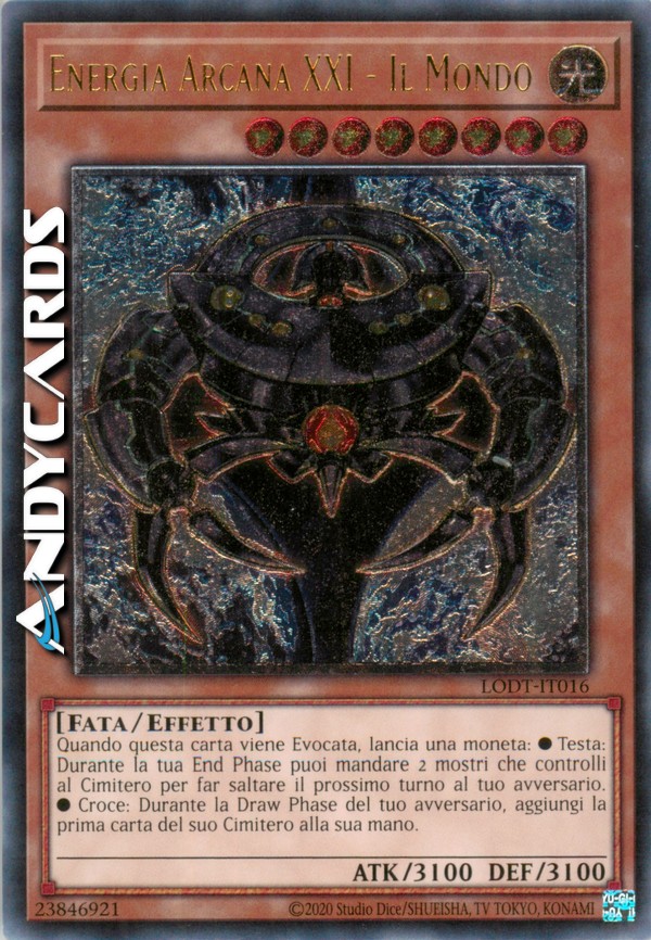 Quando questa carta viene Evocata, lancia una moneta. •Testa: Durante la tua End Phase puoi mandare 2 mostri che controlli al Cimitero per far saltare il Prossimo turno al tuo avversario. •Croce: Durante la Draw Phase del tuo avversario, aggiungi la prima carta del suo Cimitero alla sua mano.