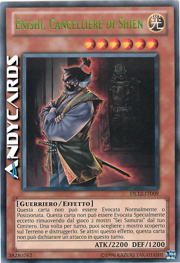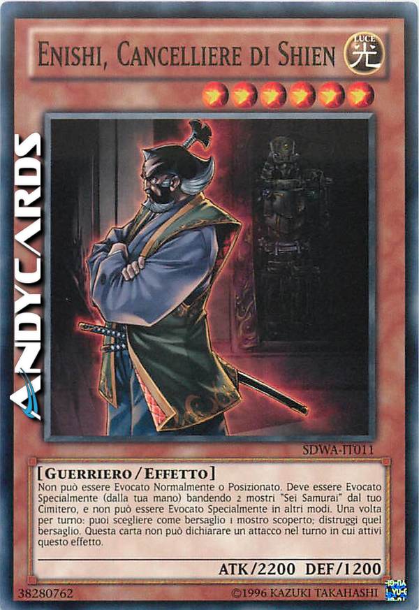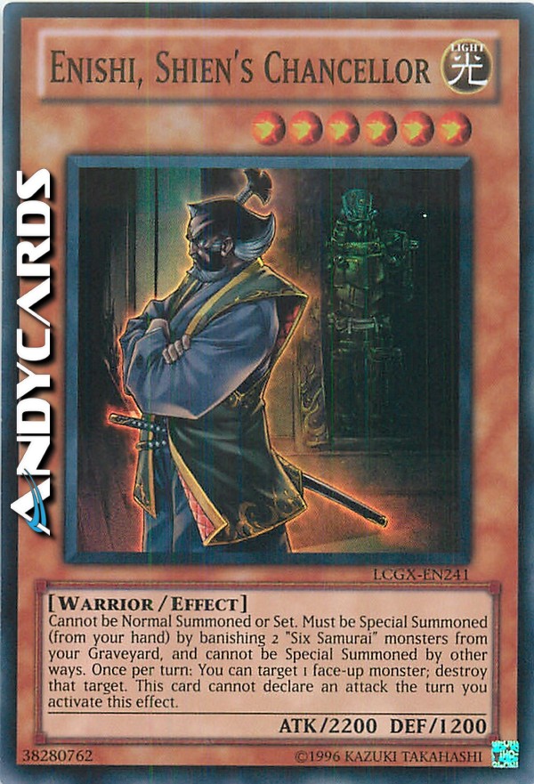 Questa carta non può essere Evocata tramite Evocazione Normale o Posizionata. Questa carta non può essere Evocata tramite Evocazione Speciale se non rimuovendo dal gioco 2 mostri "Sei Samurai" dal tuo Cimitero. Una volta per turno puoi distruggere 1 mostro scoperto. Se attivi questo effetto, questa carta non può attaccare durante questo turno.