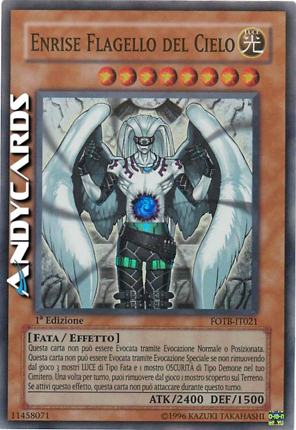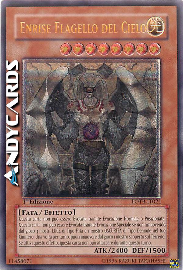 Questa carta non può essere Evocata tramite Evocazione Normale o Posizionata. Questa carta non può essere Evocata tramite Evocazione Speciale se non rimuovendo dal gioco 3 mostri LUCE di Tipo Fata e 1 mostro OSCURITA' di tipo Demone nel tuo Cimitero. Una volta per turno, puoi rimuovere dal gioco 1 mostro scoperto sul terreno. Se attivi questo effetto, questa carta non può attaccare durante questo turno.