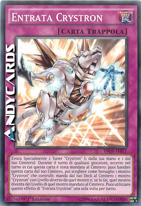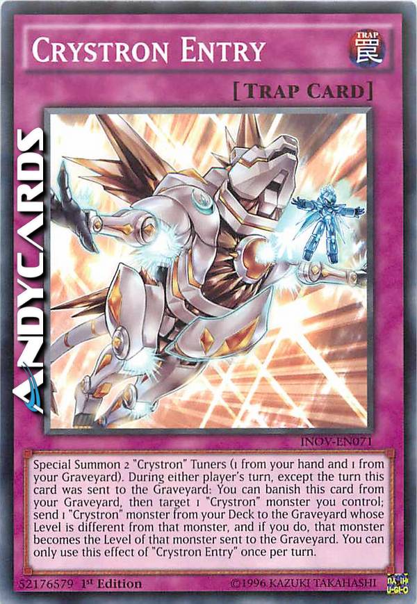 Evoca Specialmente 2 Tuner "Crystron" (1 dalla tua mano e 1 dal tuo Cimitero). Durante il turno di qualsiasi giocatore, eccetto nel turno in cui questa carta è stata mandata al Cimitero: puoi bandire questa carta dal tuo Cimitero, poi scegliere come bersaglio 1 mostro "Crystron" che controlli; manda dal tuo Deck al Cimitero 1 mostro "Crystron" con Livello diverso da quel mostro e, se lo fai, quel mostro diventa del Livello di quel mostro mandato al Cimitero. Puoi utilizzare questo effetto di "Entrata Crystron" una sola volta per turno.
